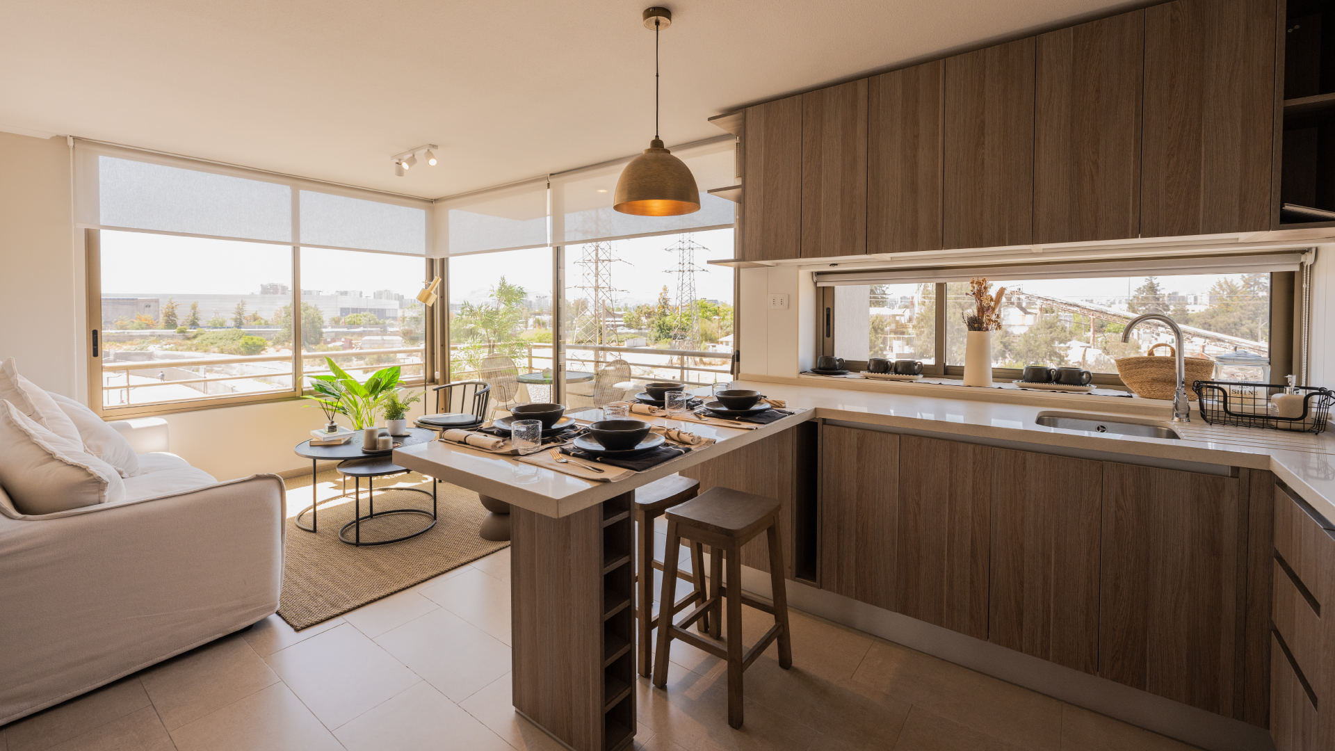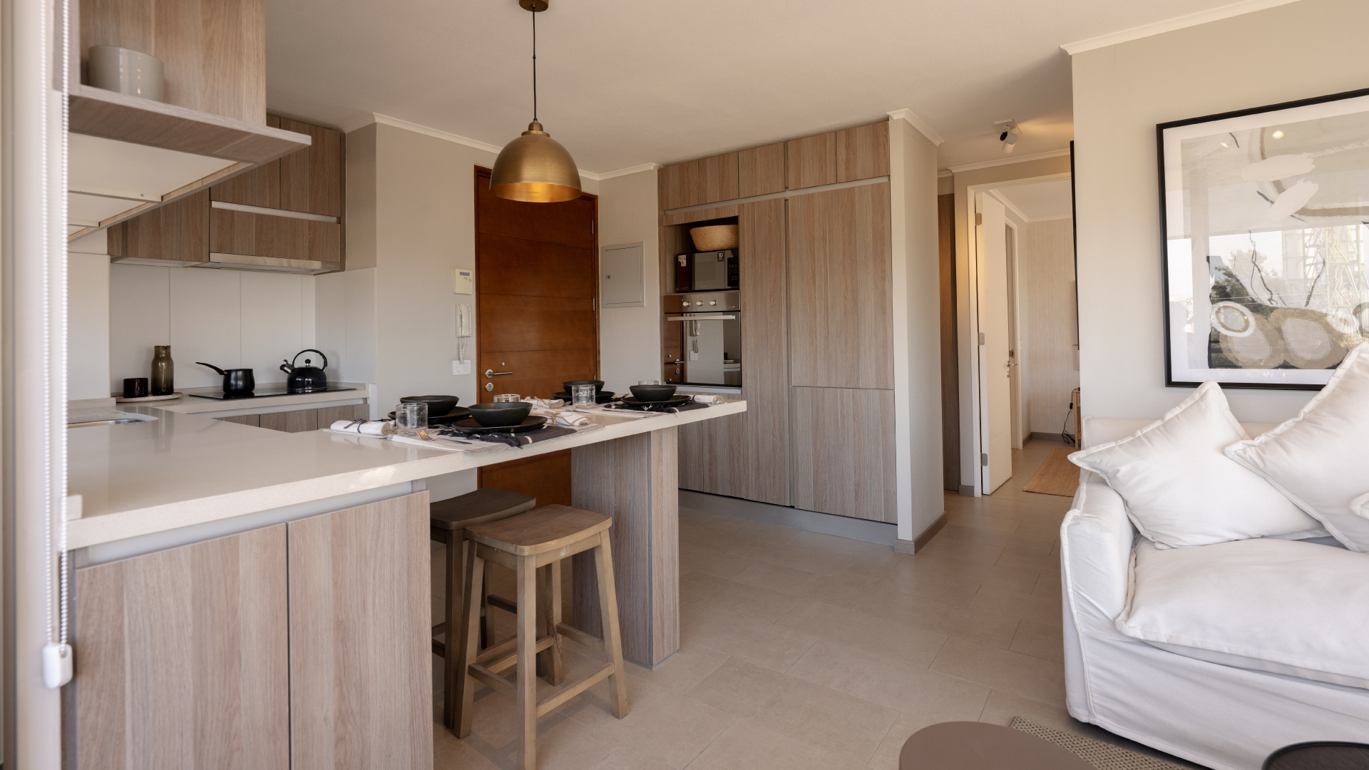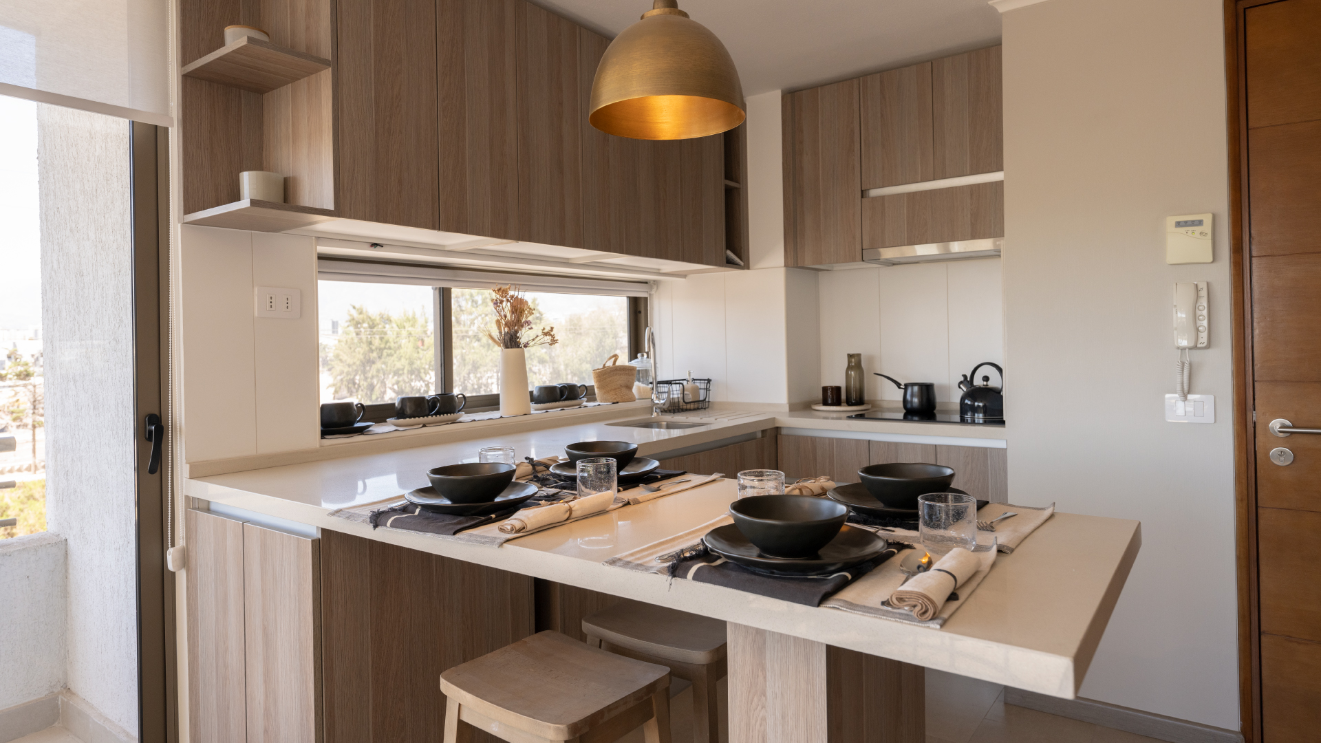 Cocina equipada con encimera vitrocerámica, horno eléctrico y campana · Cubiertas de Granito · Piso Gres porcelánico