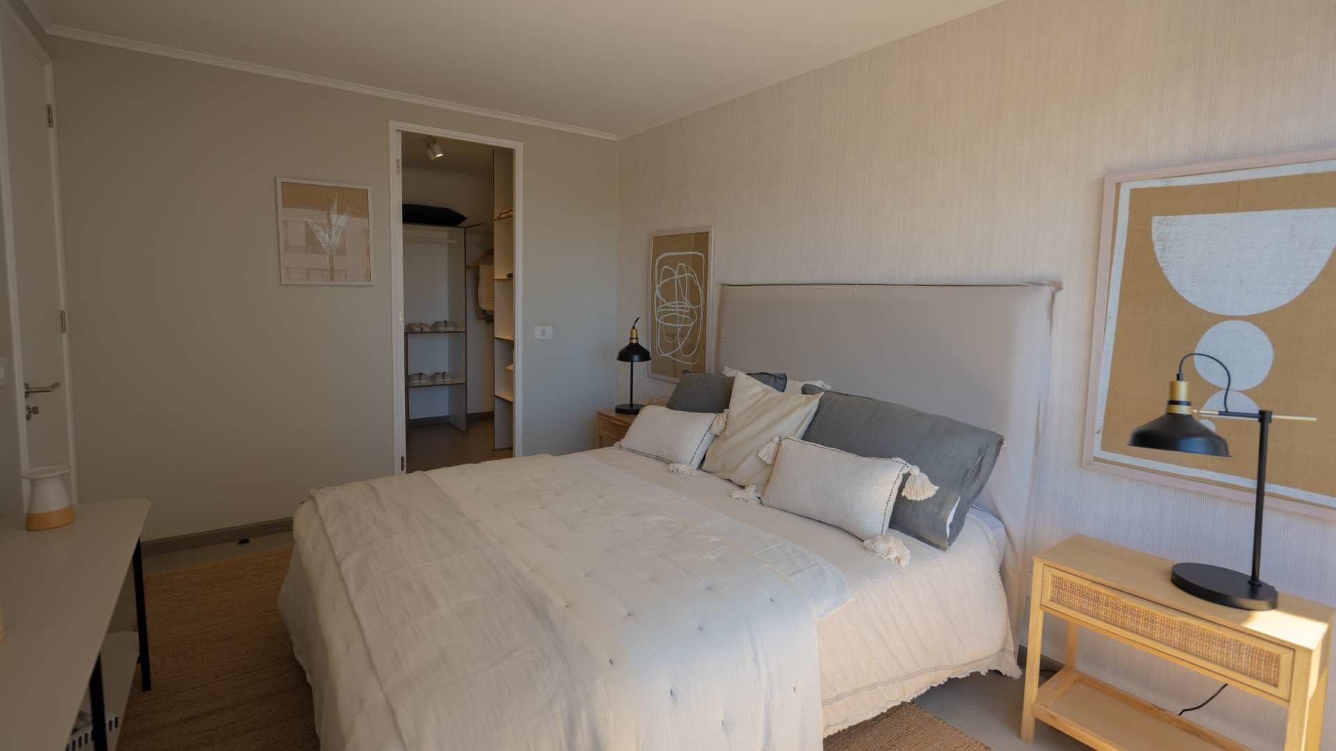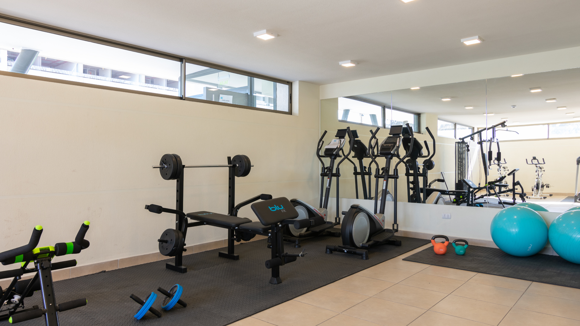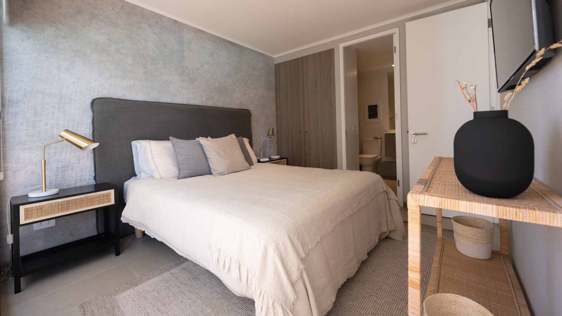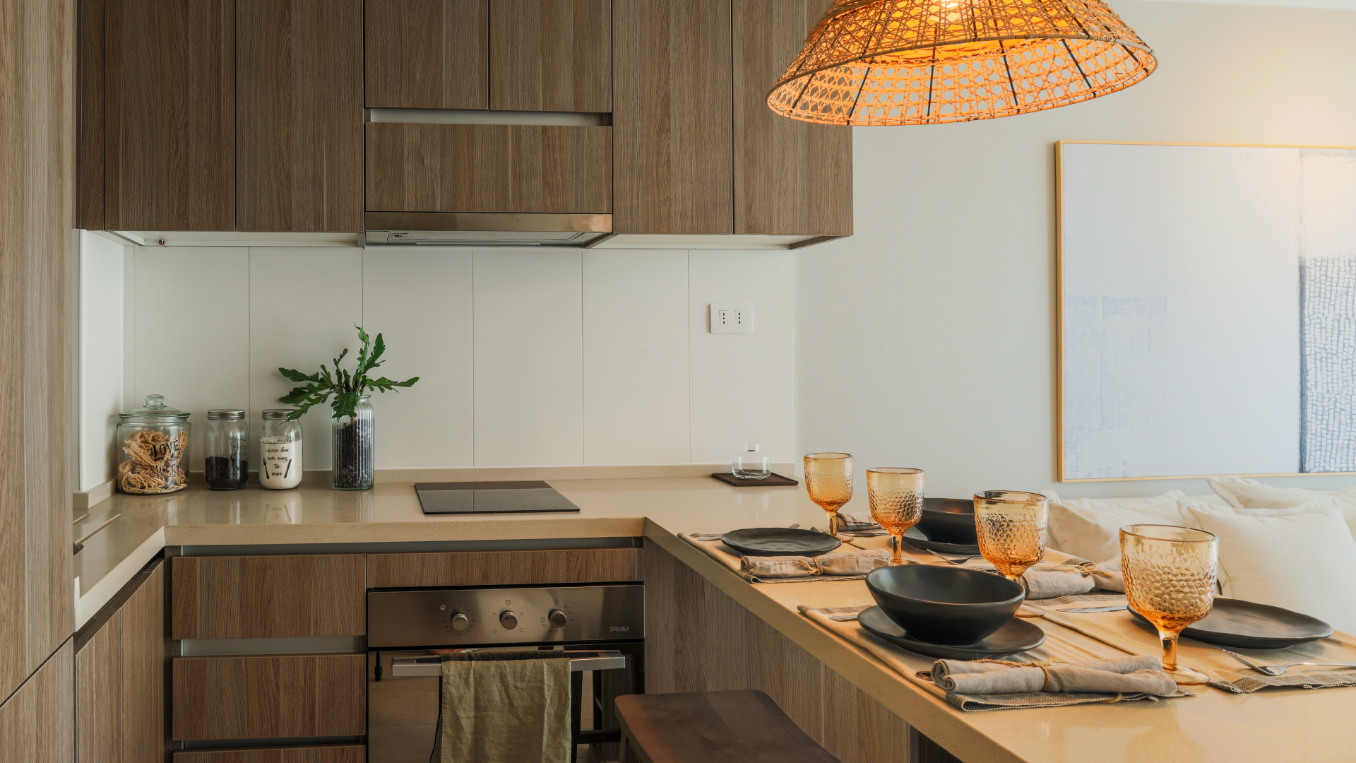 Cocina equipada con encimera vitrocerámica, horno eléctrico y campana · Cubiertas de Granito · Piso Gres porcelánico